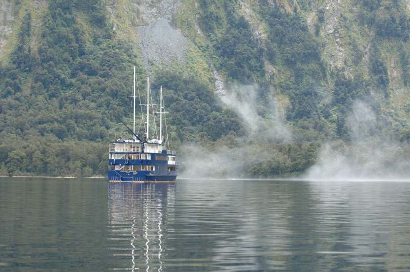 On our Doubtful Sound overnight cruise - view of the "Fiordland Explorer" from a kayak